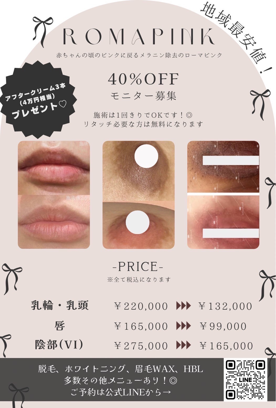 針を使わず一回の施術でピンクに♡ (唇、乳輪、脇、VIO、肘、膝)の後天的な黒ずみ・色素沈着に施術可能脱毛後のVIOの黒ずみ色素沈着もピンクへ